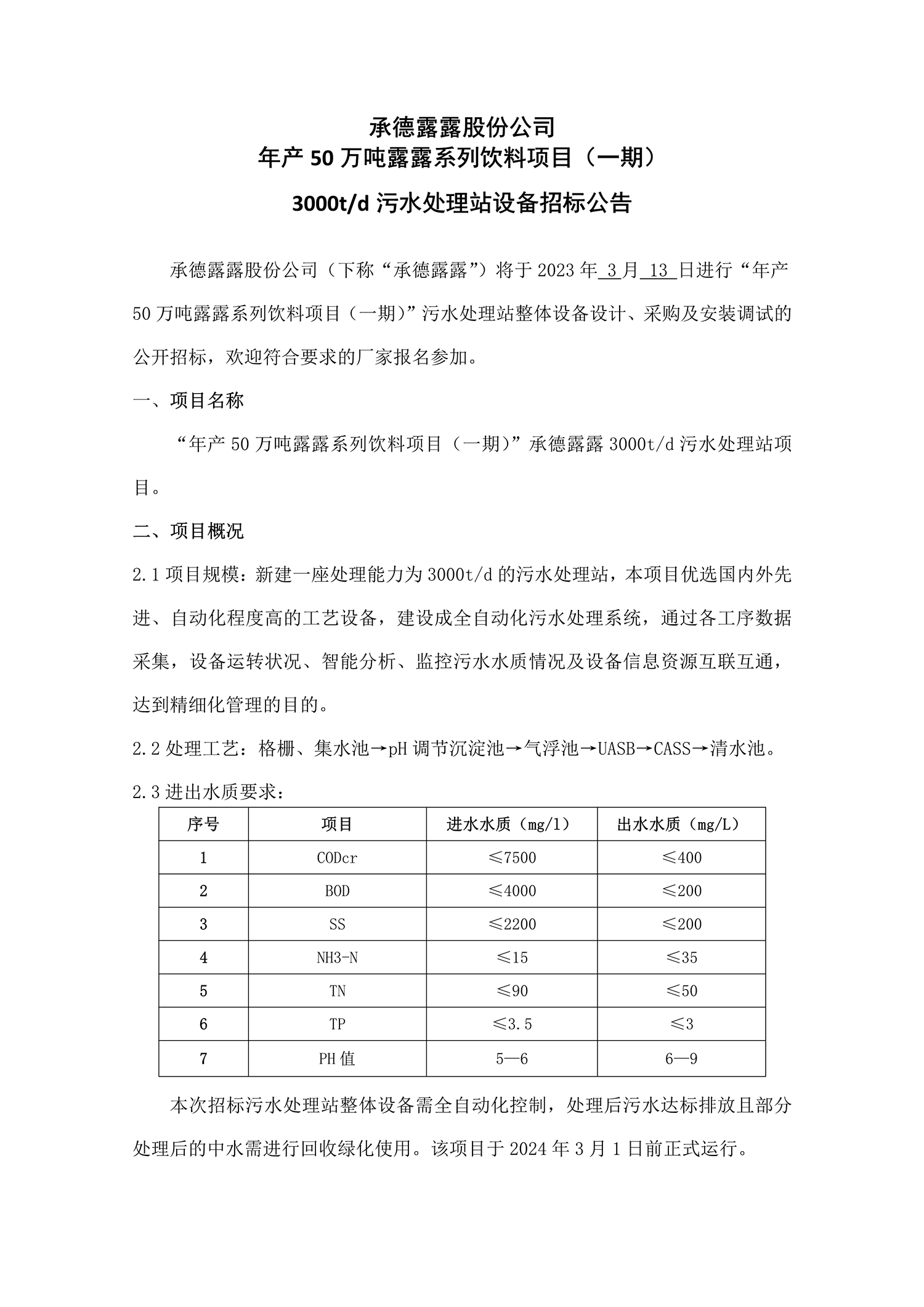 承德露露股份公司 年產(chǎn)50萬噸露露系列飲料項(xiàng)目(一期) 3000t/d污水處理站設(shè)備招標(biāo)公告